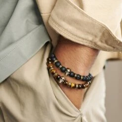 Arkai Bracelets Rico Couleur Or Rose En Pierre De Lave, Jaspe Impérial Turquoise Et Pendentif Crâne