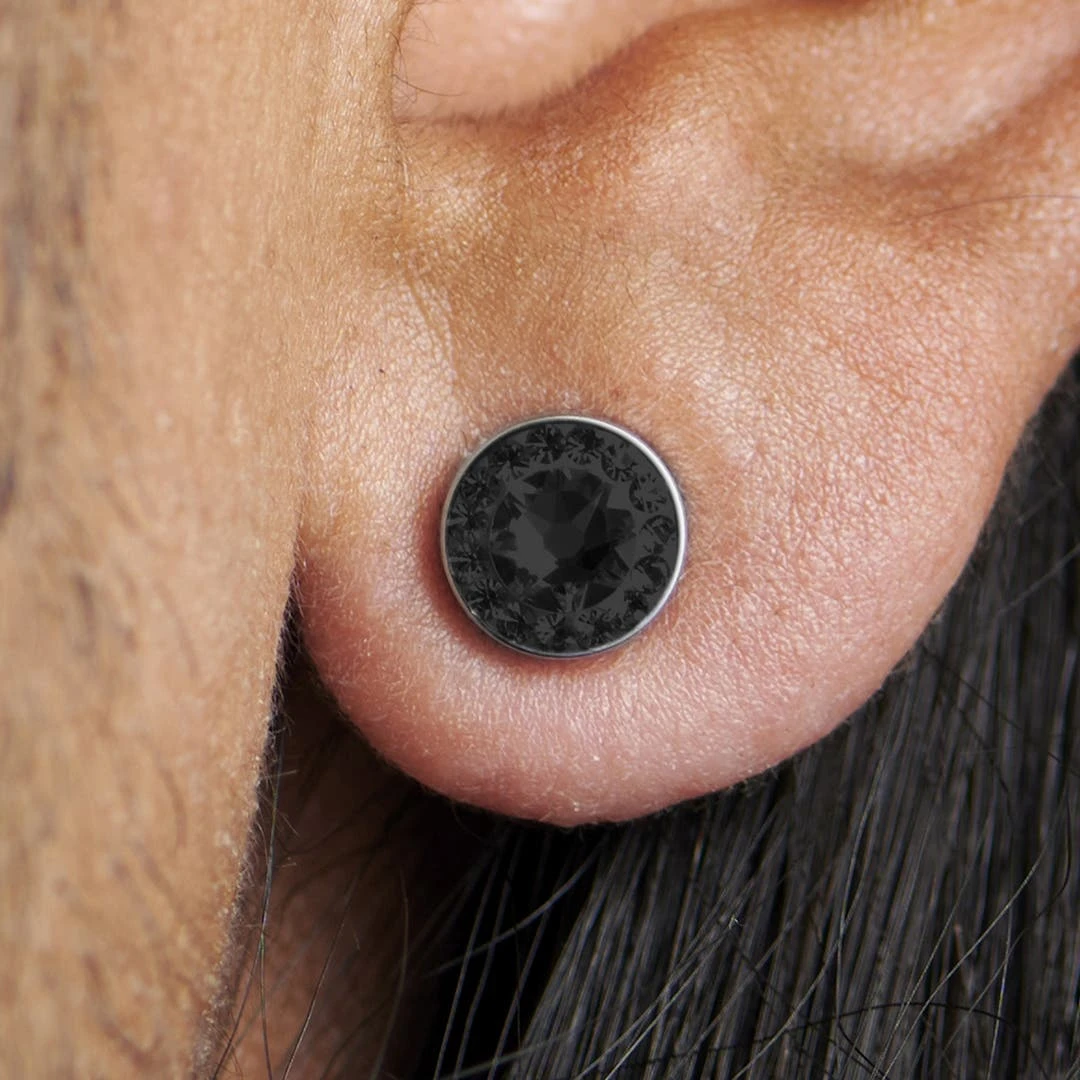 Une boucle d’oreille composée de cristaux noirs incrustés dans un écrin en acier inoxydable sans nickel. Ce modèle est aimanté et ne nécessite donc pas de piercing pour être mis en place. Le prix indiqué est pour une seule boucle d’oreille.