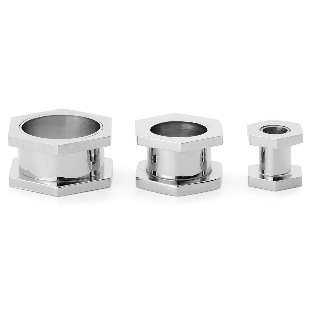 Ce tunnel à double rebord est fabriqué d’acier chirurgical poli avec un design d’écrou hexagonal.