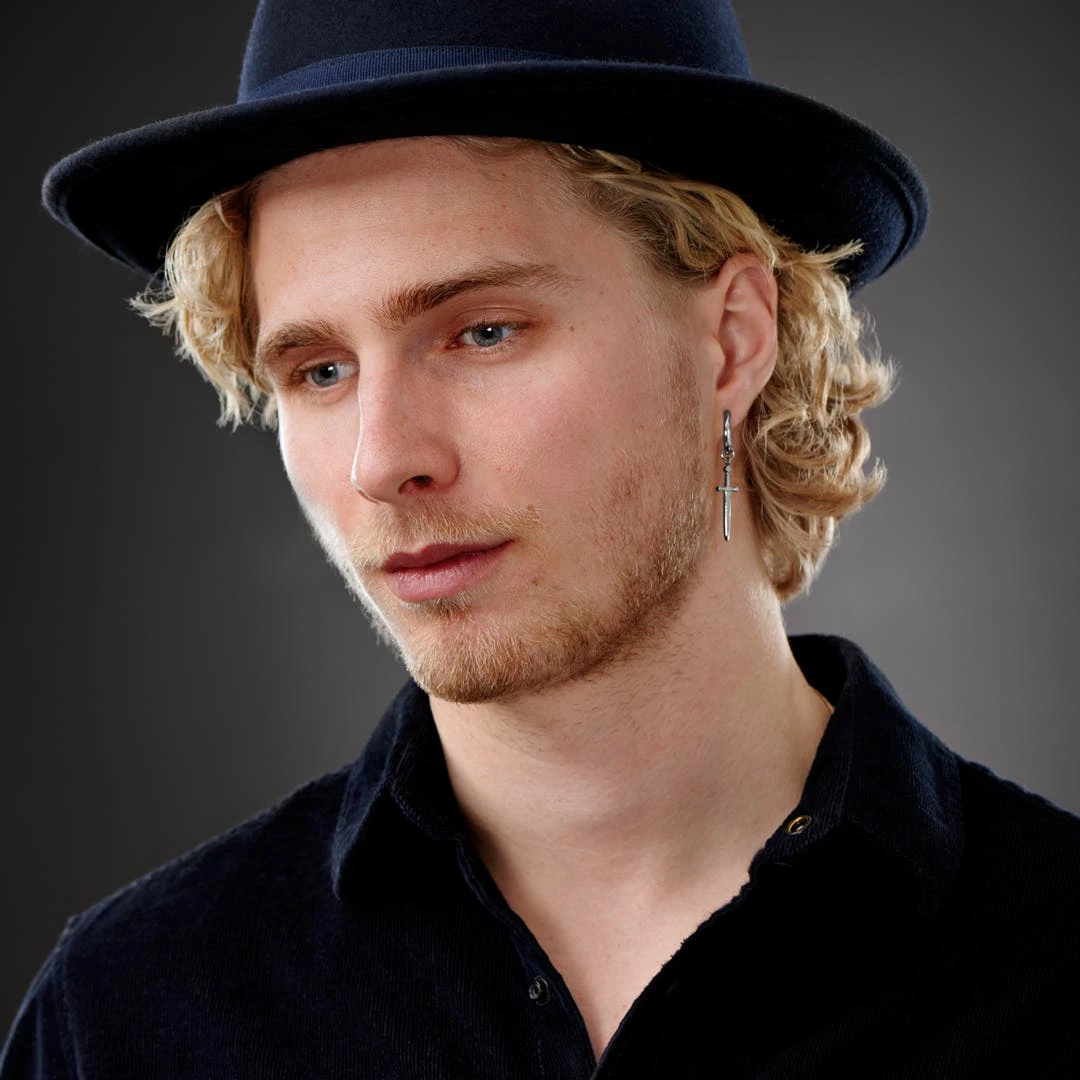Préparez-vous pour la bataille avec cette boucle d’oreille pour homme accompagnée d’un pendentif en forme d’épée.