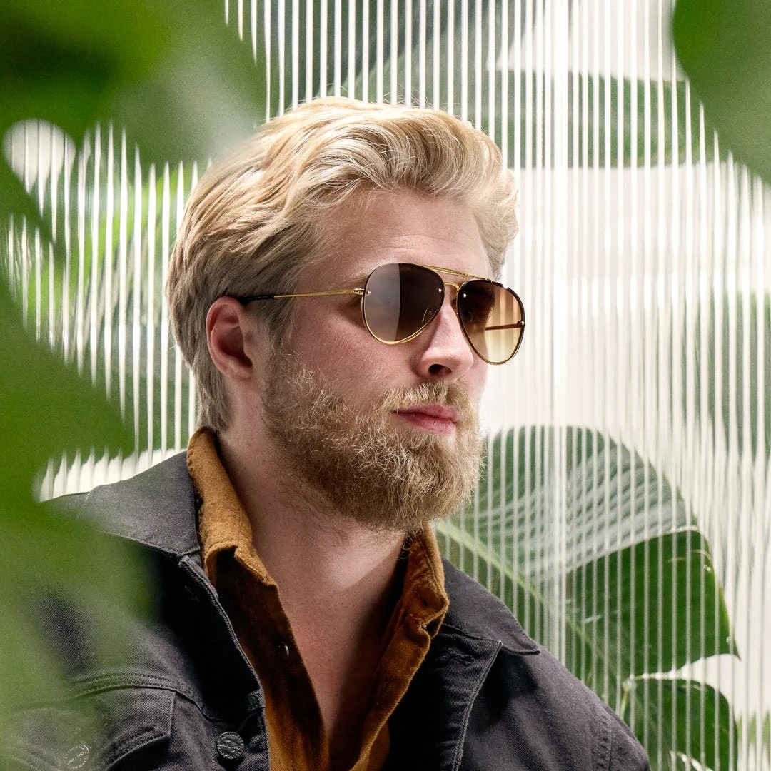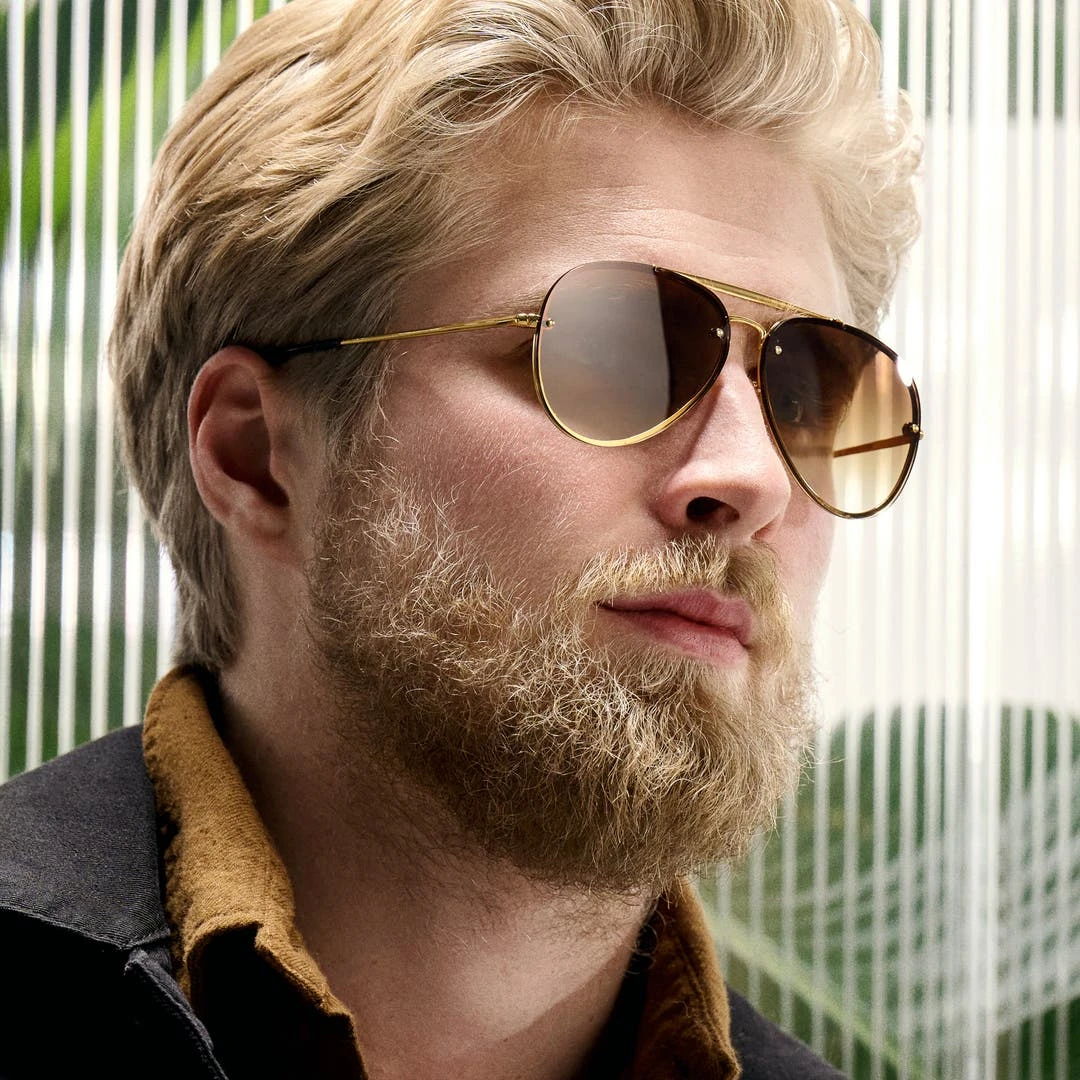 Une paire de lunettes de soleil aviateur dorées pour homme, parfaites pour peaufiner votre look de star du grand écran.